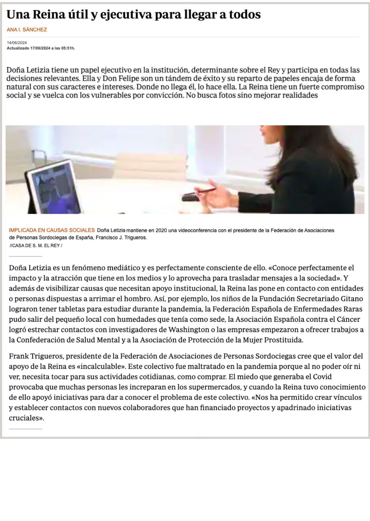 El mes pasado, el periódico ABC se puso en contacto con nuestro presidente, Francisco Trigueros, a petición de la Casa Real, para entrevistarle con motivo del 10 aniversario de la coronación de SM el Rey Felipe VI. En este enlace podréis ver el reportaje completo «Una reina útil y ejecutiva para llegar a todos»: https://archive.ph/afWJ2